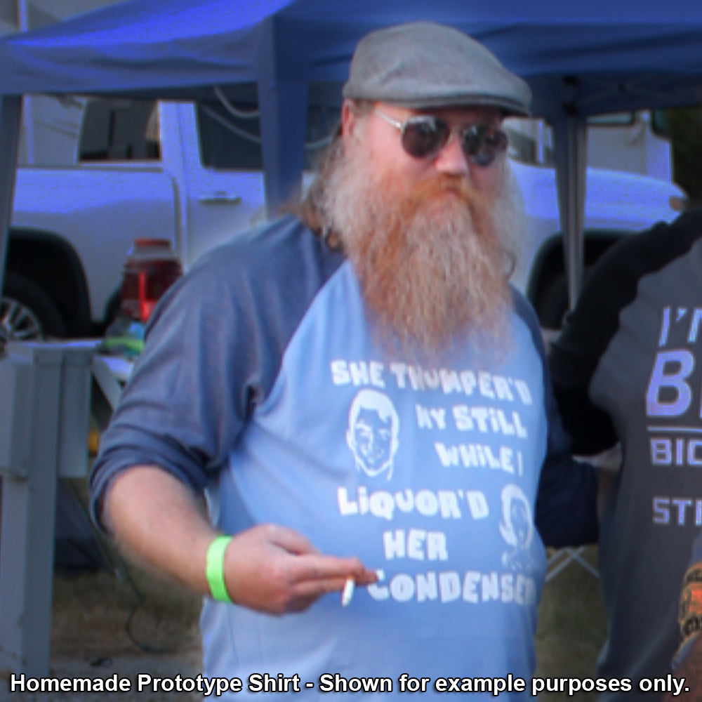 Technically functionally accurate (vapors from the still get "thumper'd" by the thumper/doubler, and the condenser does get "liquor'd" when the vapors condense), while also making a very adult-oriented (and silly!) joke, this shirt is NOT for the faint of heart!