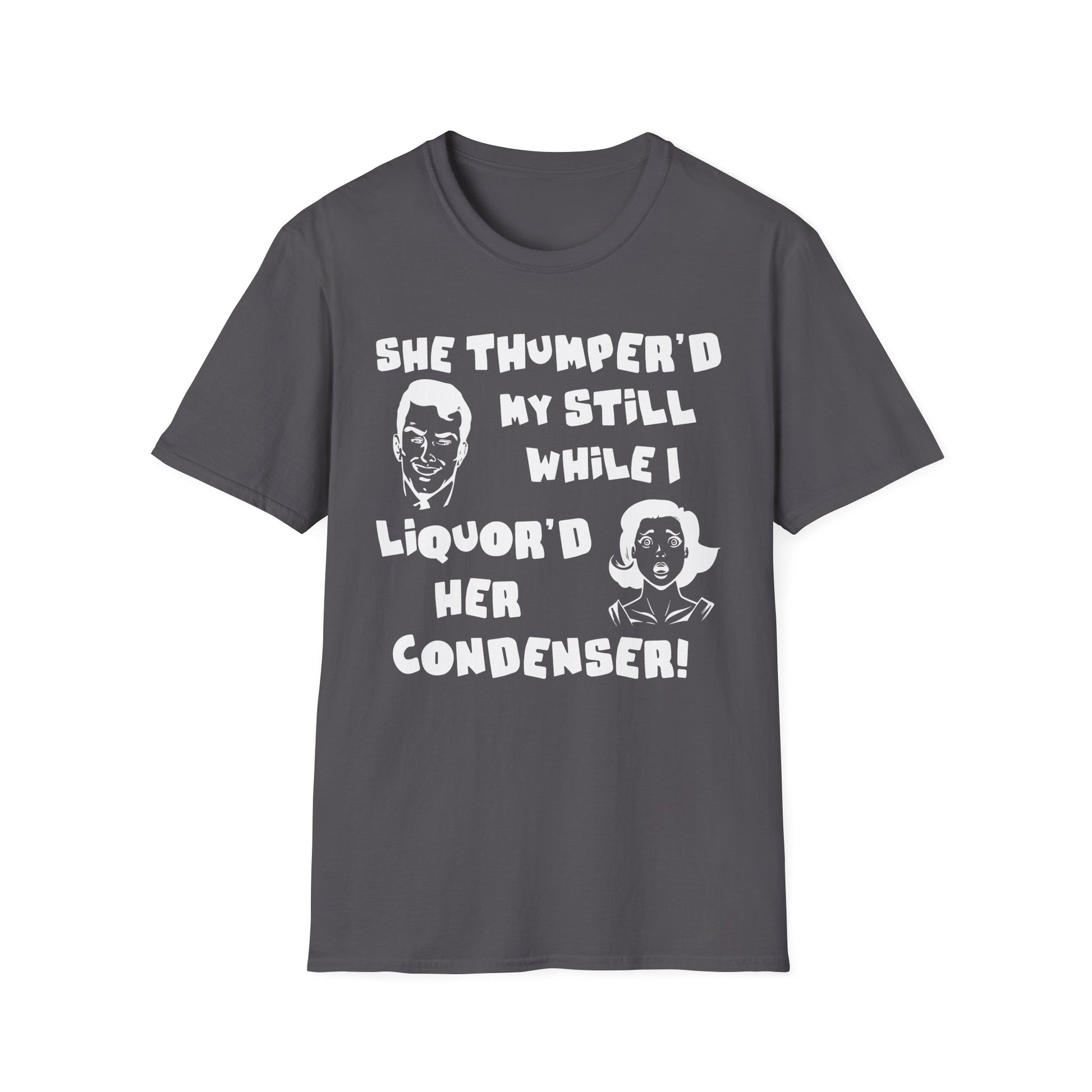 Thumper'd My Still / Liquor'd Her Condenser! Humorous Moonshine & Distilling Funny Softstyle Tee T-Shirt